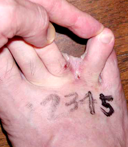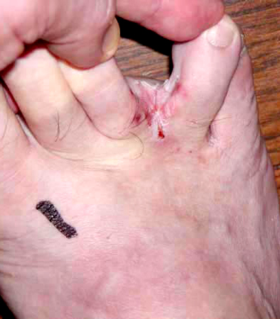 かゆくてたまらず指の間を見てみると、患部から汁が出てジュクジュク状態です。