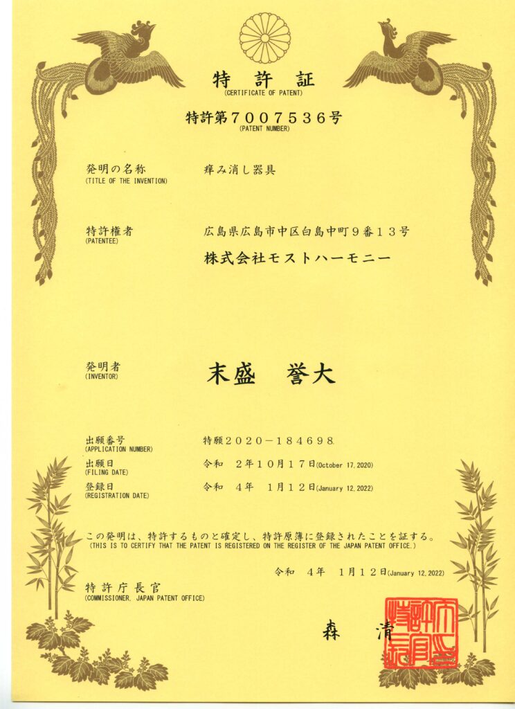 特許出願をして、今年のはじめに特許庁より認可を受けました。
